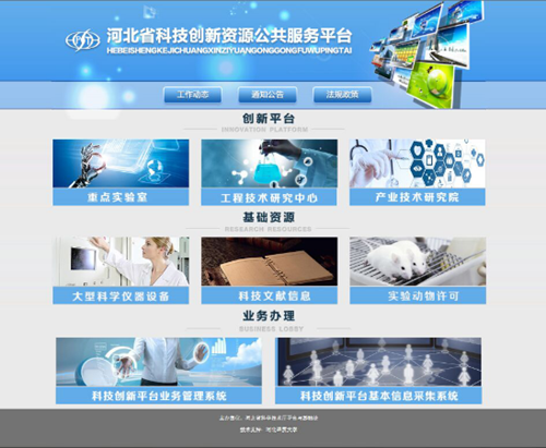 2015年12月15日,由科技廳設計開發的“河北省科技創新資源公共服務平臺”網站正式開通。該網站作為河北省科學技術廳廳網下屬二級網站,以科技創新平臺和科技創新資源統籌為重點,系統整合了省級以上重點實驗室、工程技術研究中心、產業技術研究院、大型科學儀器設備共享服務、科技文獻服務、實驗動物行政許可等分散在不同工作體系的服務功能和相關信息,集中公開展示科技創新平臺工作動態、通知公告、政策法規和已建重點實驗室、工程技術研究中心、產業技術研究院基本信息及實驗動物生產許可、使用許可信息,并鏈接河北省大型科學儀器資源共享服務聯盟、科技文獻服務網和科技創新平臺業務管理系統。
